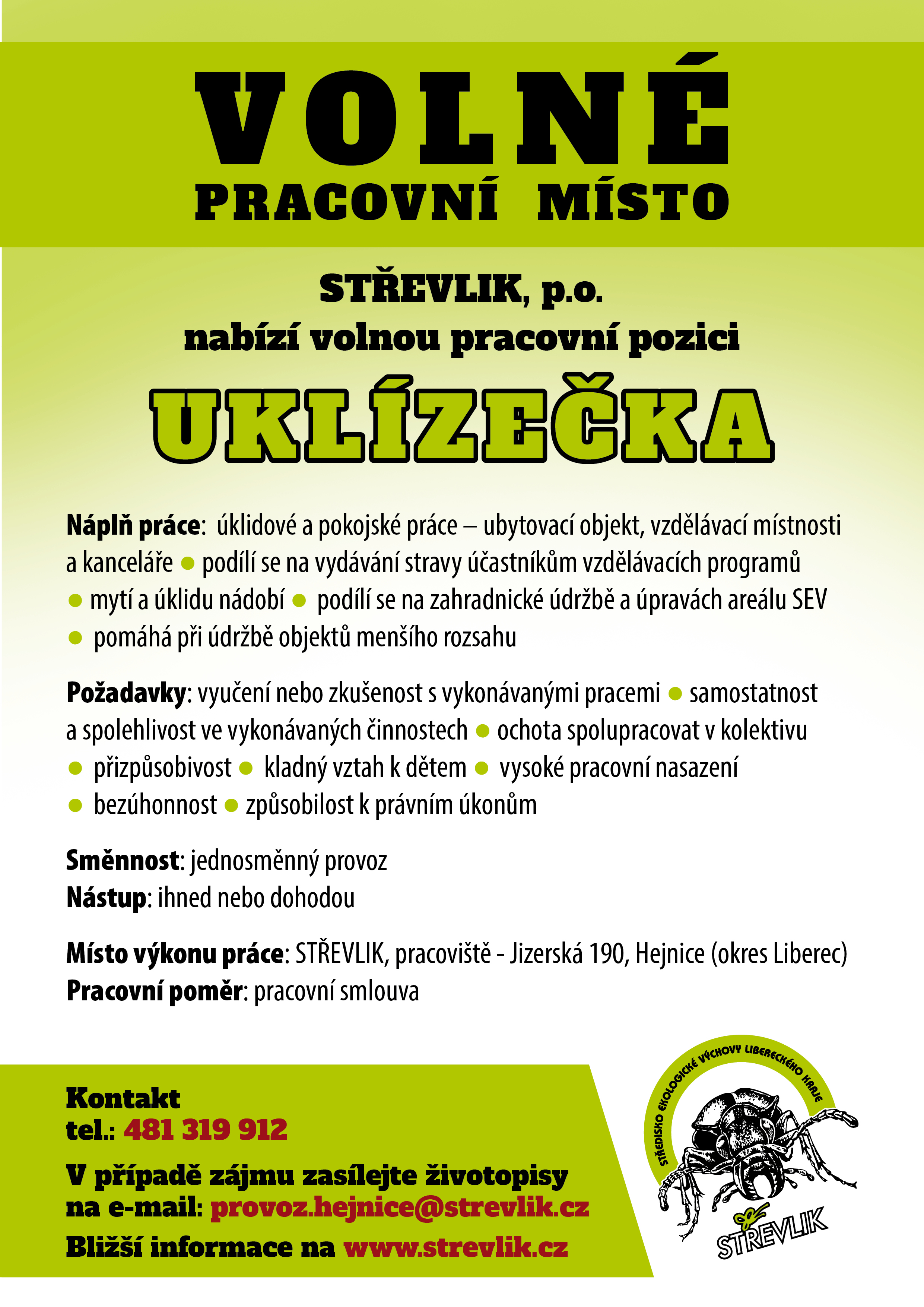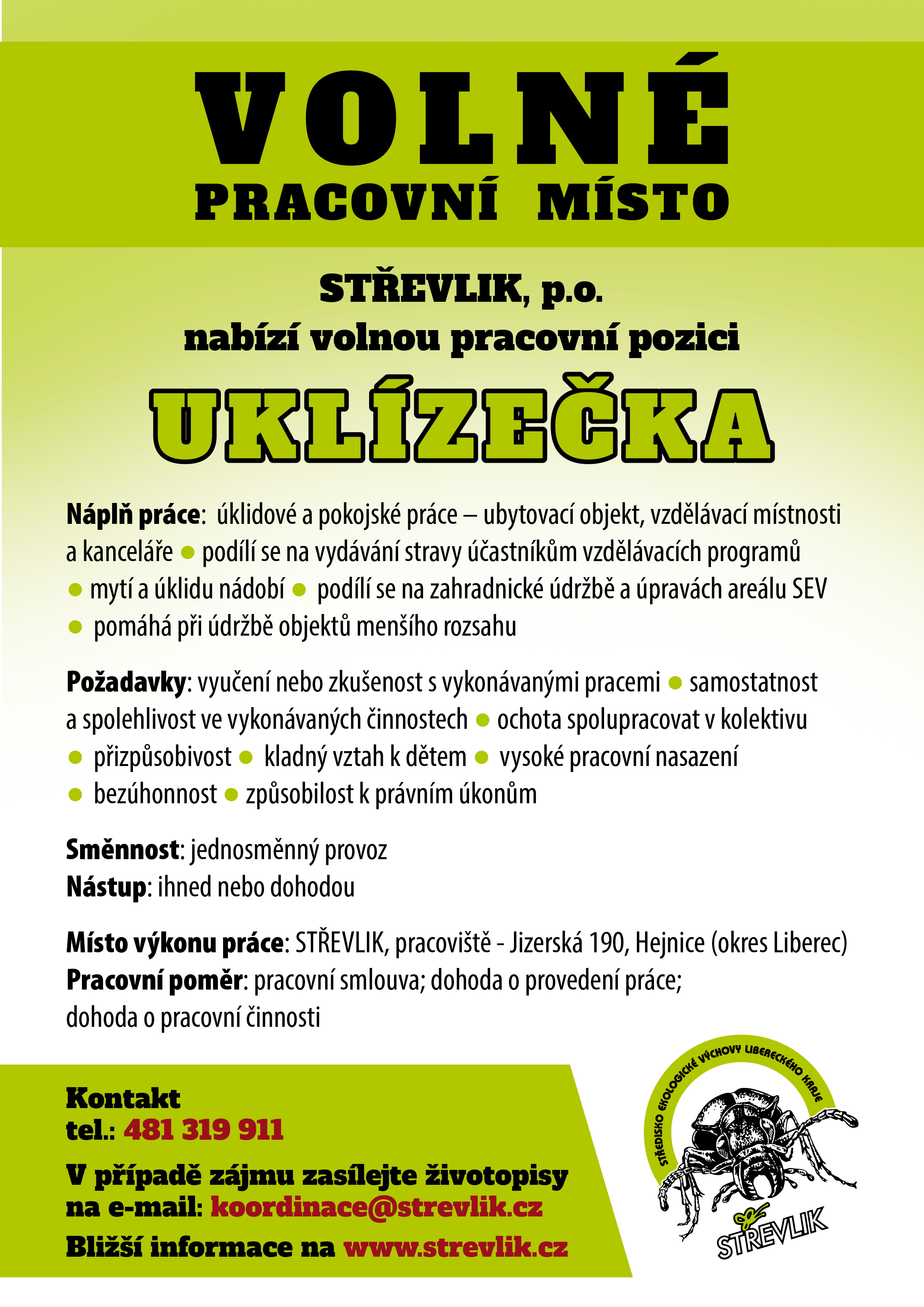 V případě zájmu o zapojení do týmu STŘEVLIKu zašlete životopis a krátký motivační dopis na adresu koordinace[zavináč]strevlik.cz. V případě uvolněného místa Vás oslovíme.