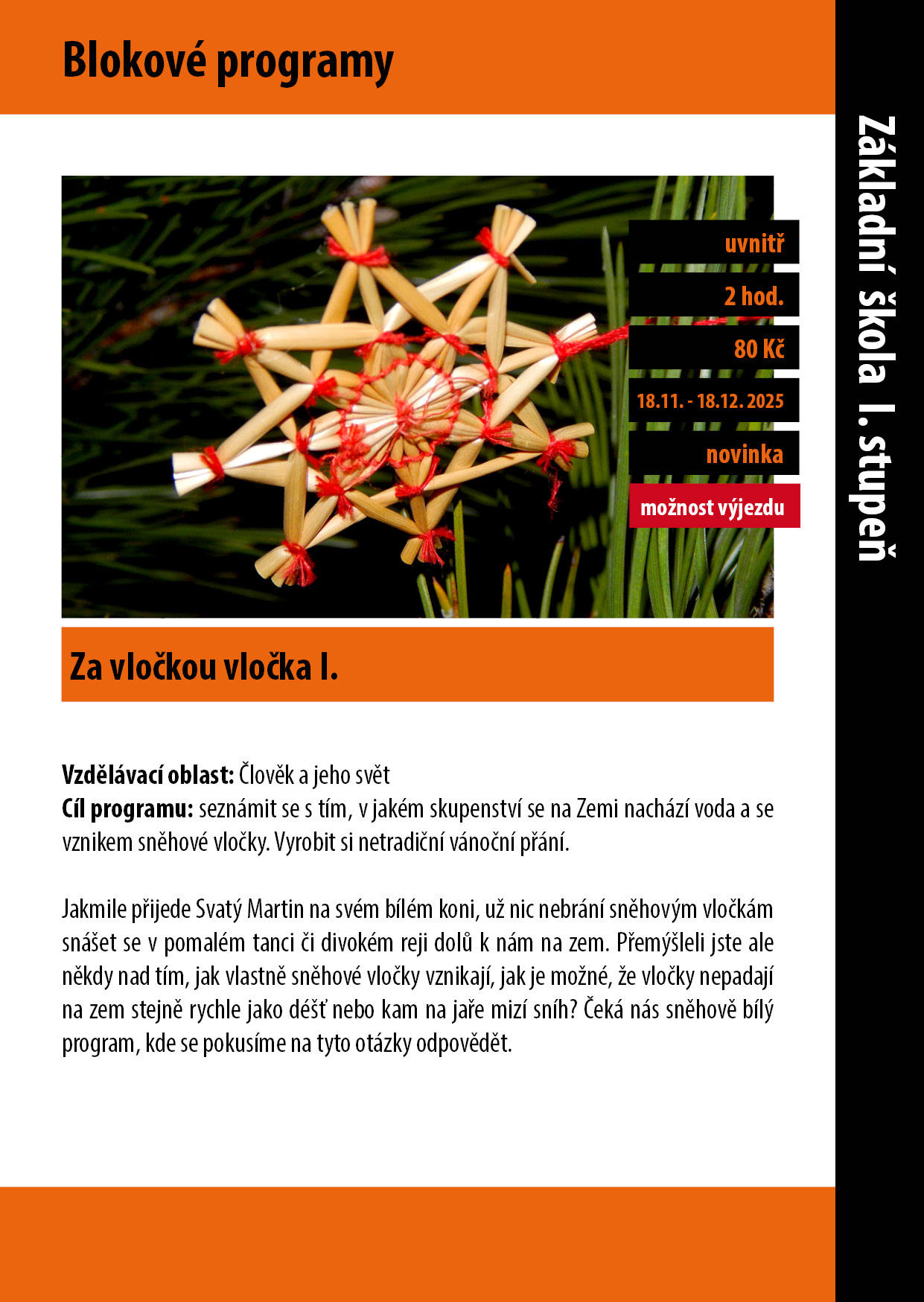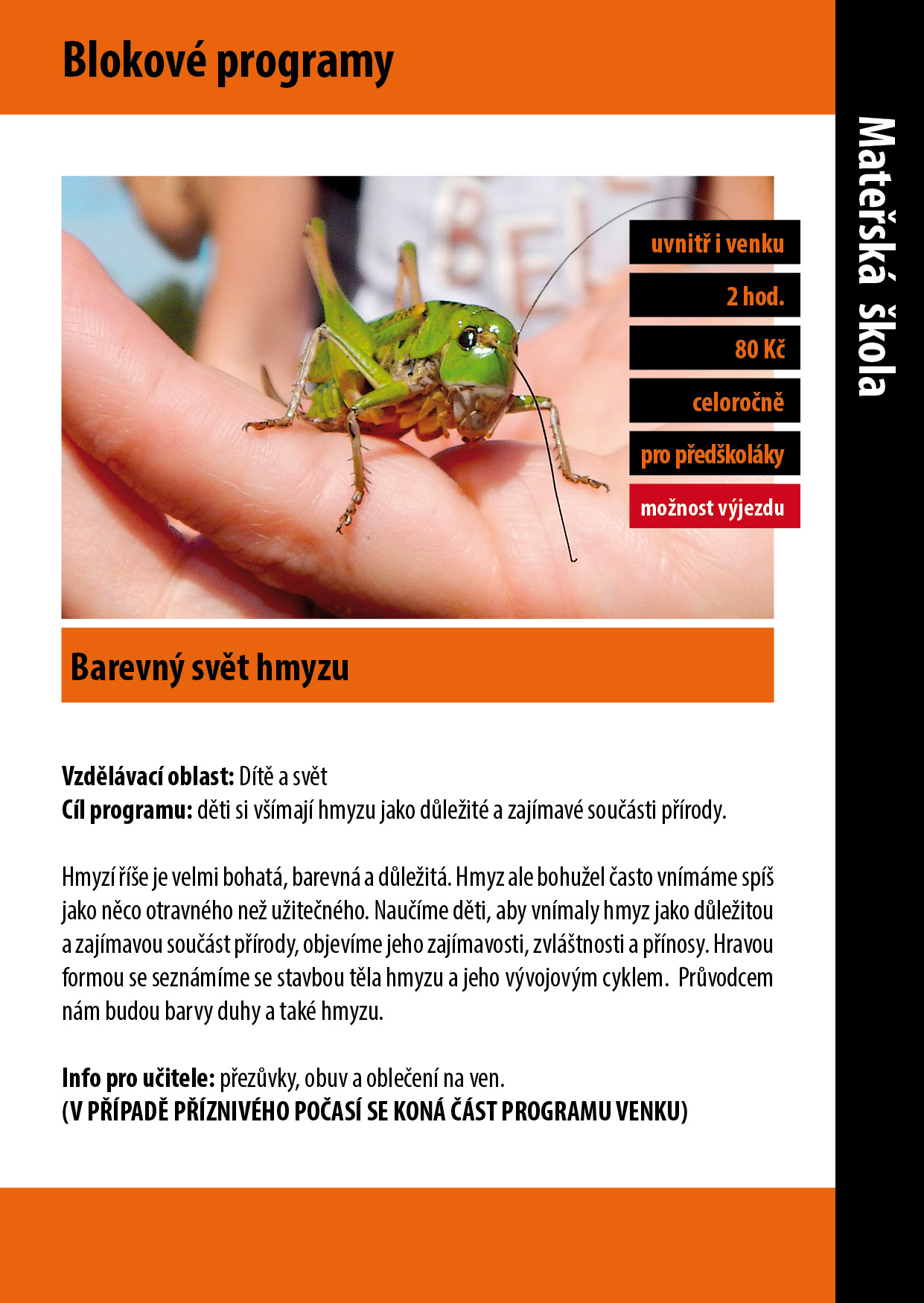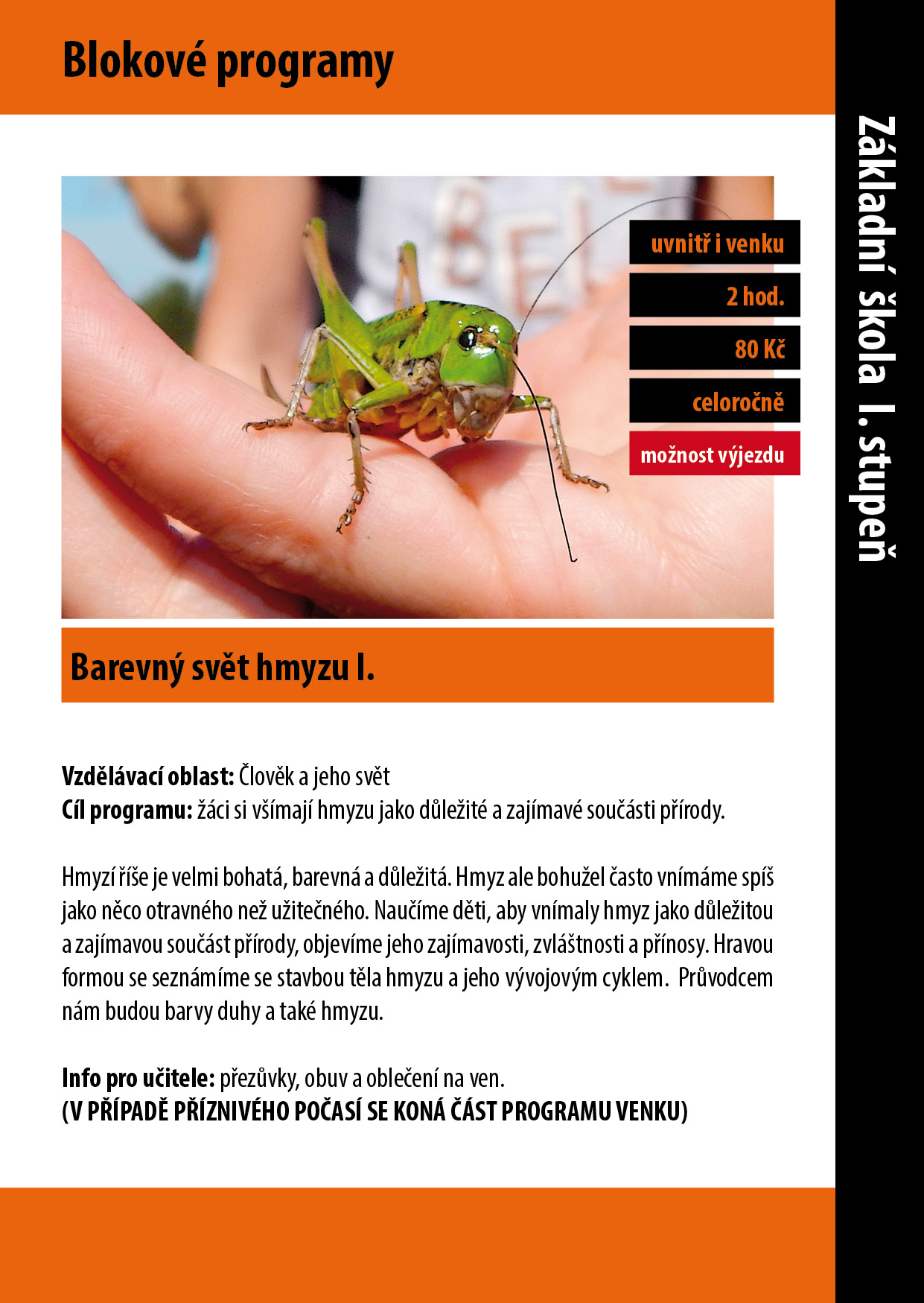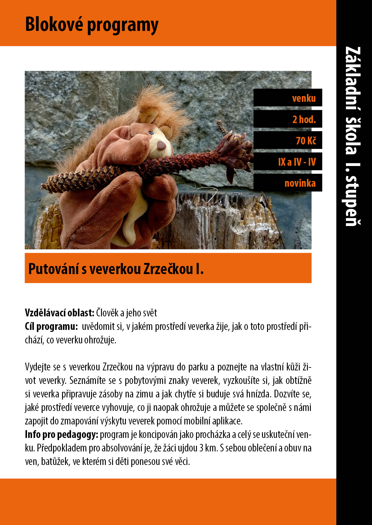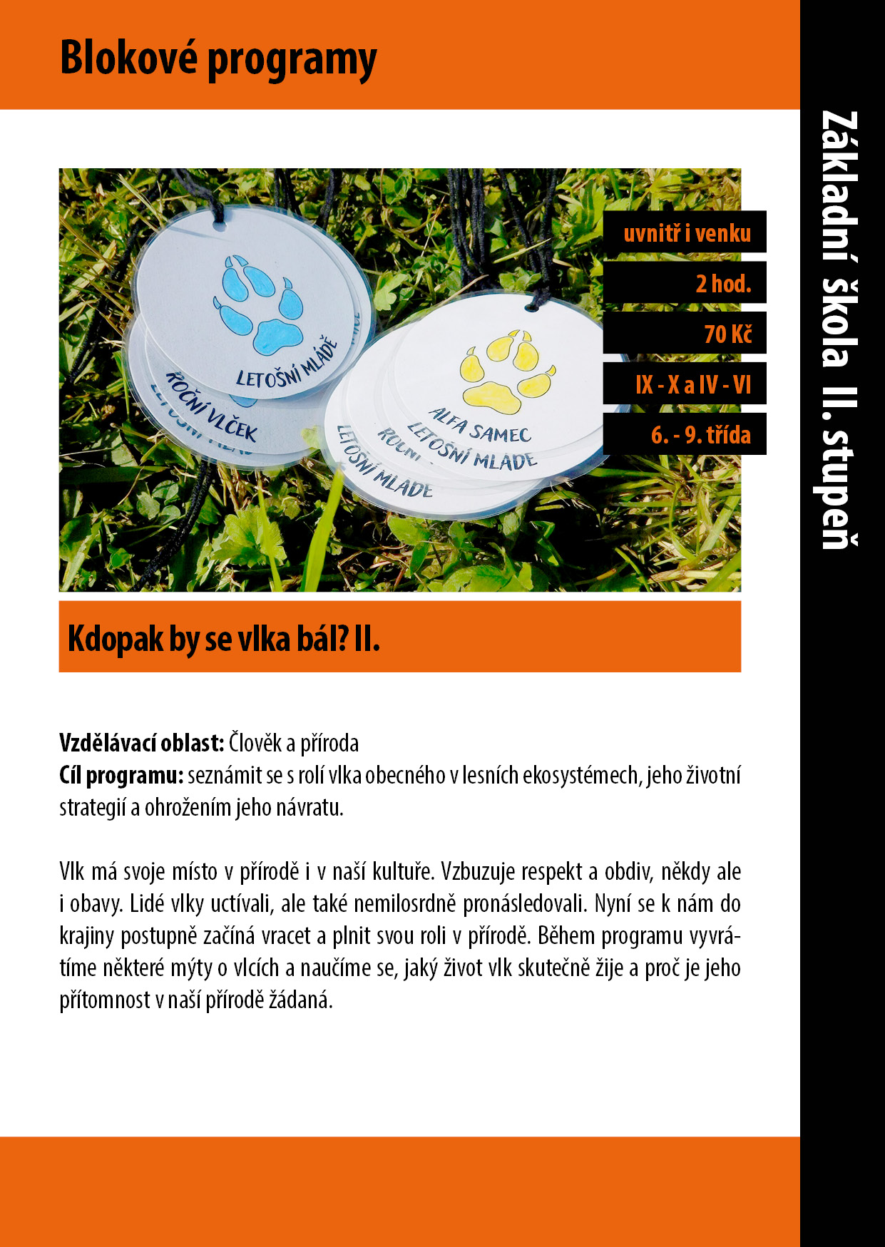 | uvnitř i venku | 2 hod. | 70 Kč | IX - X a IV - VI | 6. - 9. třída | |