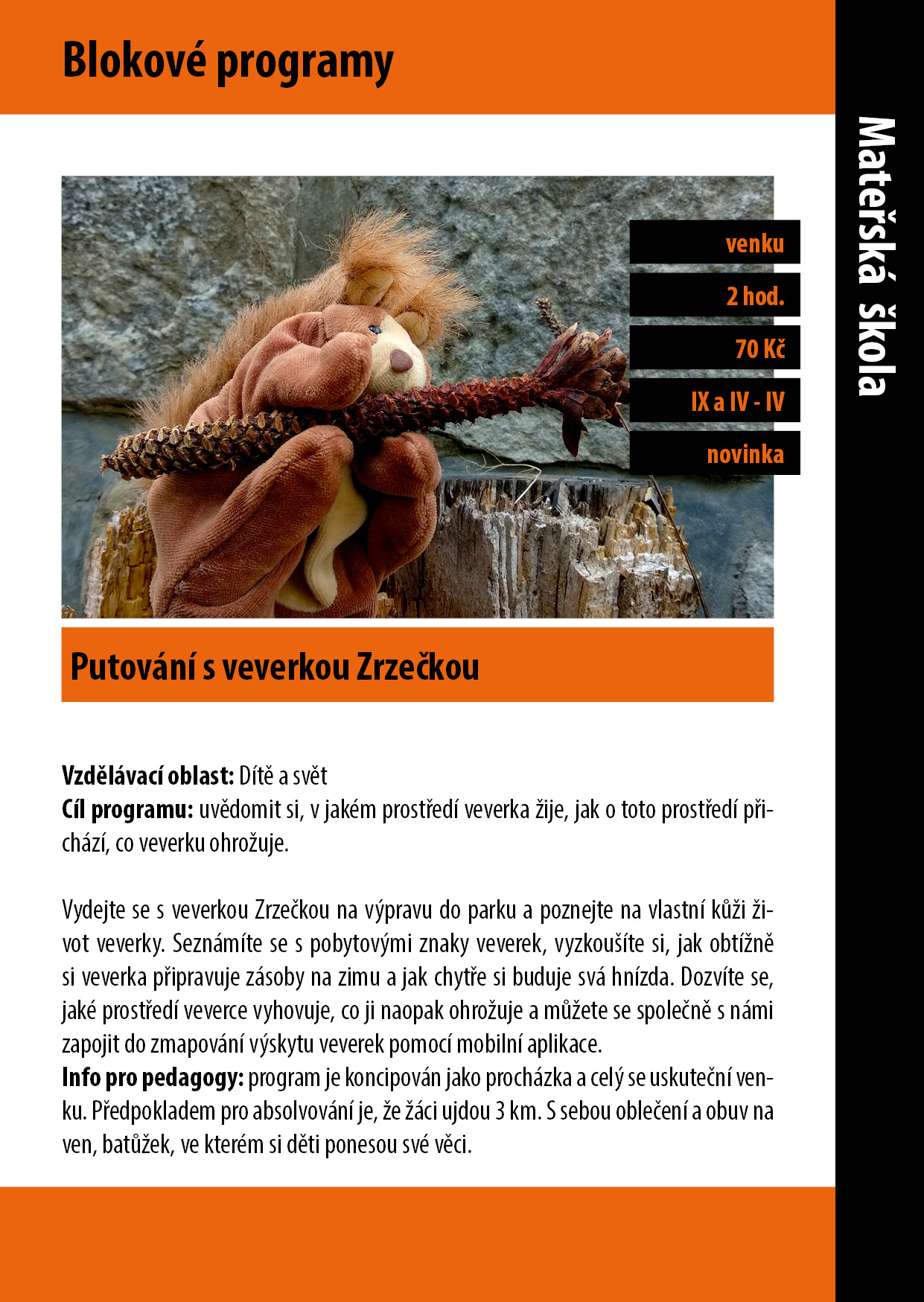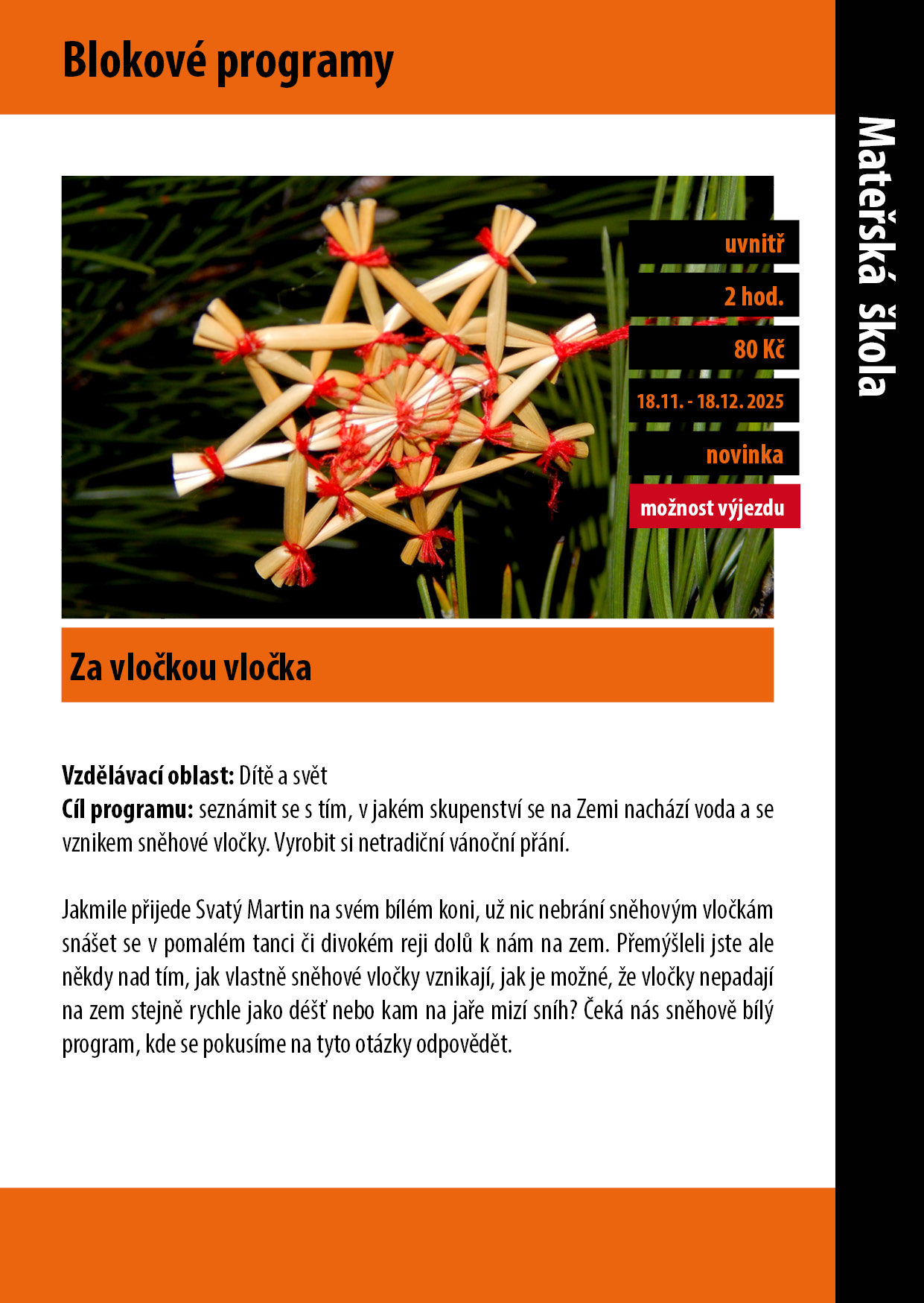 | uvnitř i venku | 2 hod. | 80 Kč | celoročně | pouze pro předškolní třídy, *možnost výjezdu | |