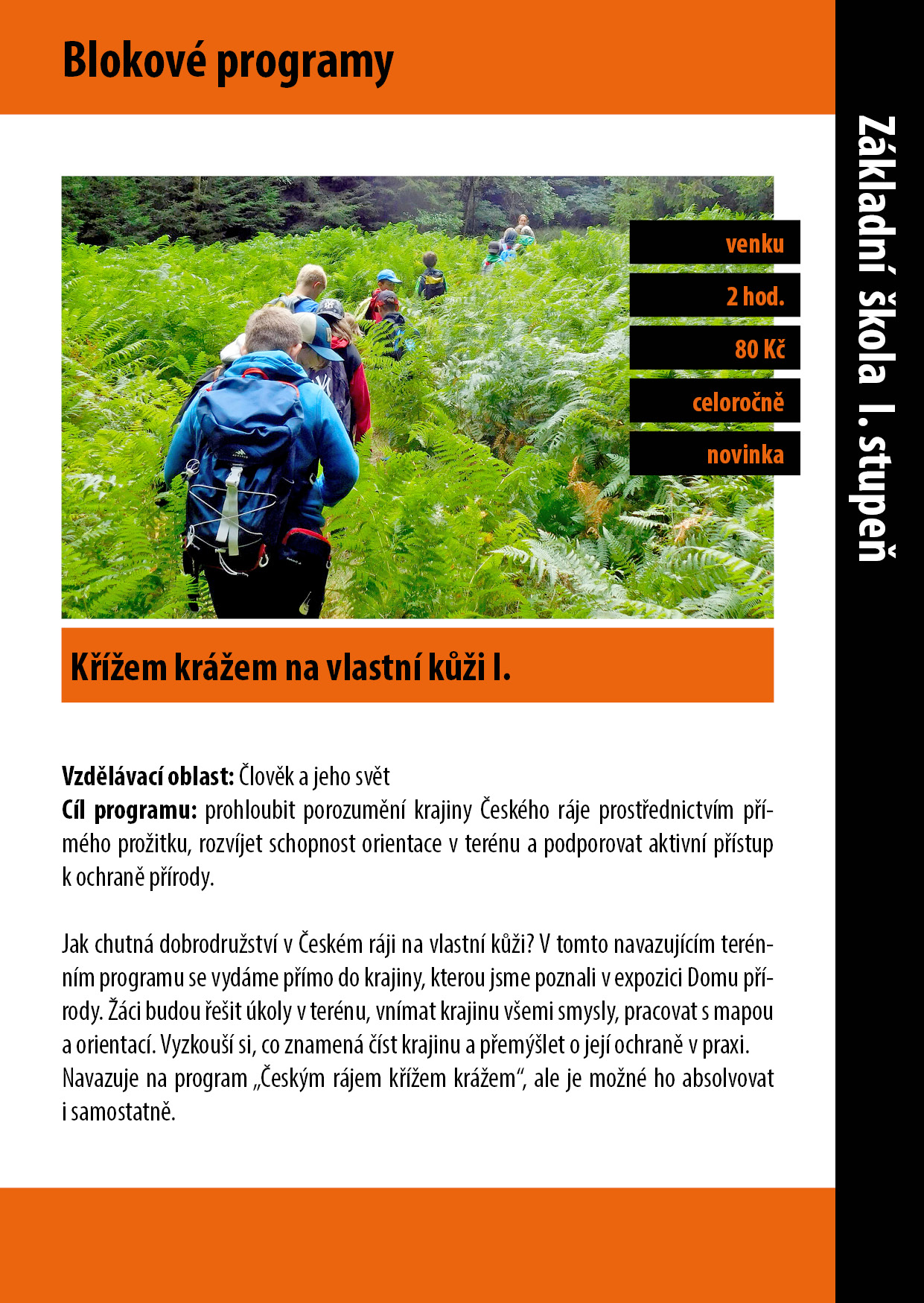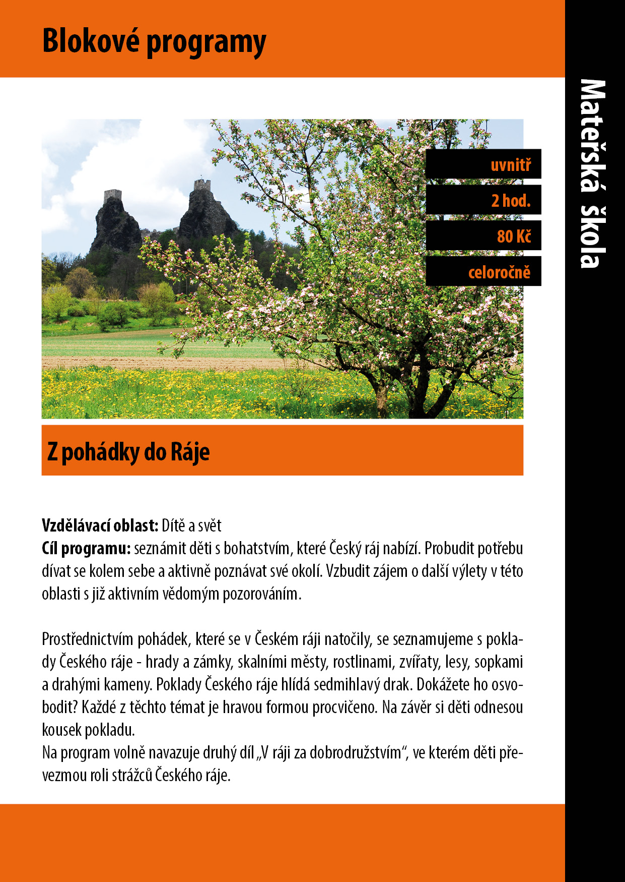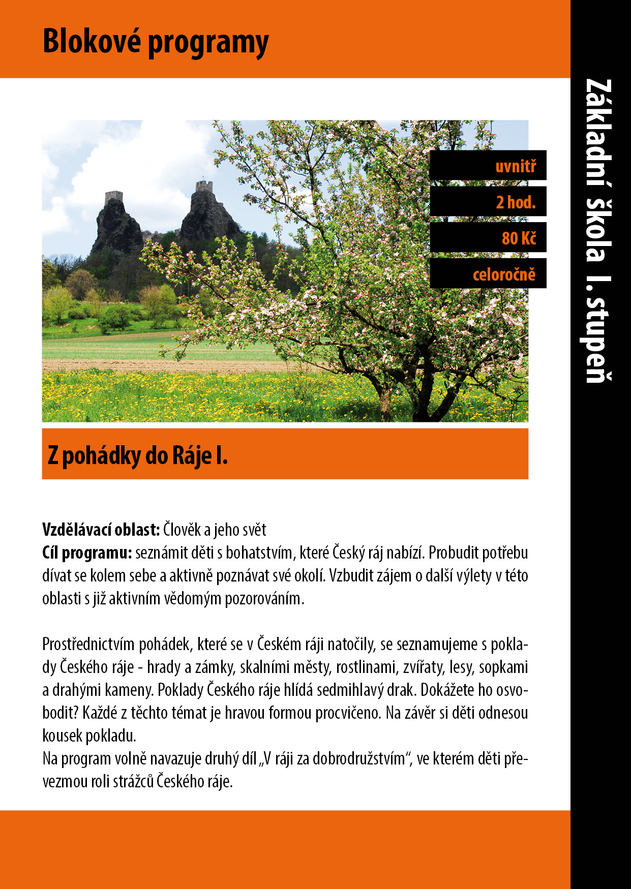 | Českým rájem křížem krážem I. | uvnitř | 2 hod. | 80 Kč | celoročně | 4. - 5. třída |